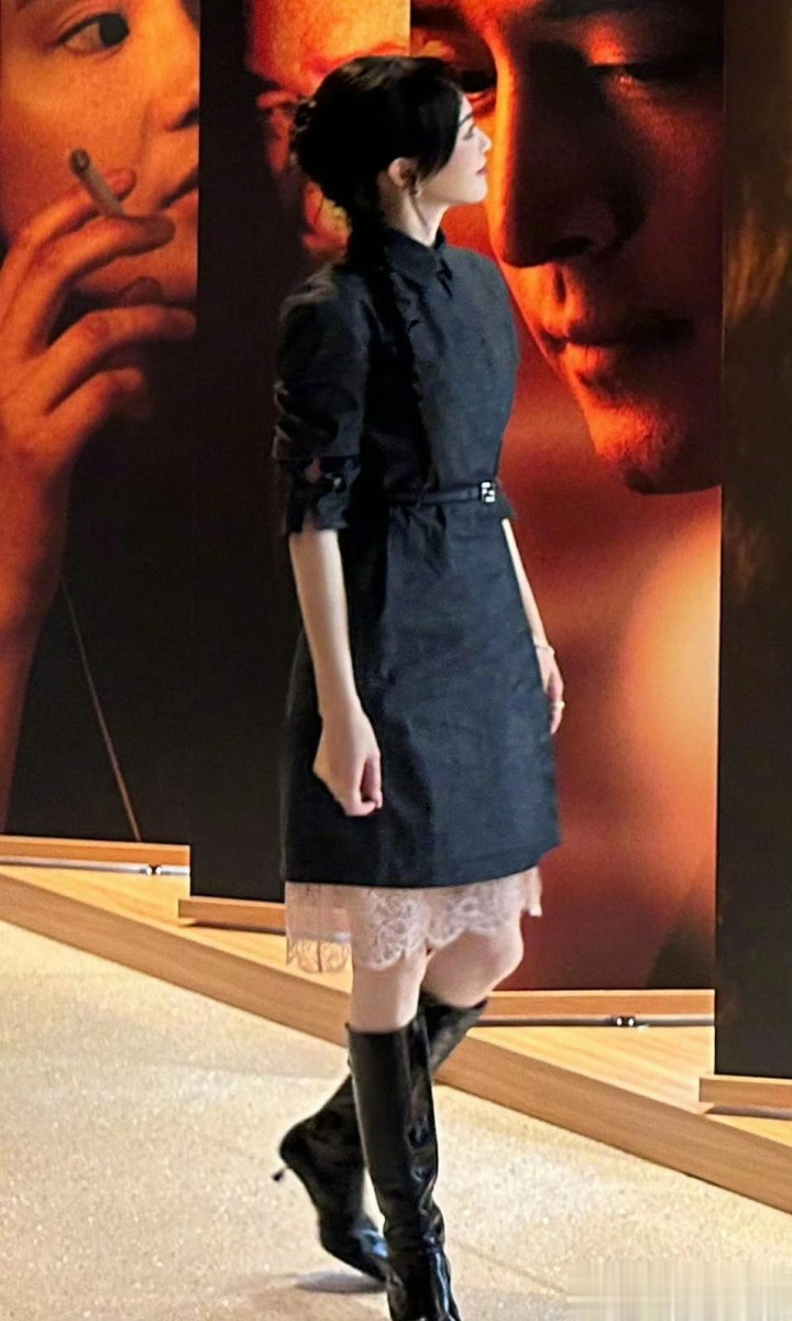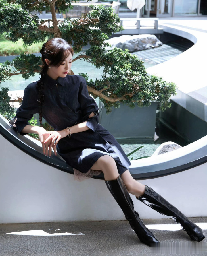 朱珠她身着粉衣配黑裙, 色彩碰撞鲜活吸睛, 微卷发慵懒垂落肩头