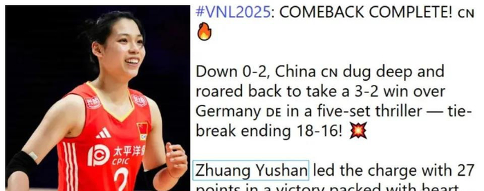 当终场哨声在阿灵顿球馆炸响,记分牌定格在18-16,现场DJ用嘶哑的嗓音高喊“China wins!”时,镜头第一时间对准了那个蹦跳着与队友撞胸庆祝的22岁女孩——庄宇珊。就在几分钟前,正是她面对德国队的赛点,连扣带拦连拿3分,把中国女排从悬崖边硬生生拉回。国际排联的官方海报随之出炉:庄宇珊腾空扣杀的单人剪影配上“COMEBACK COMPLETE”字样,官网首页罕见地置顶了整整12小时;社交媒体更是用27秒的高光视频反复播放她的五记重扣、两记拦网,配文毫不吝啬地写下“Zhuang Yushan led the charge”。一夜之间,“中国加比”的标签被世界排坛迅速认领。