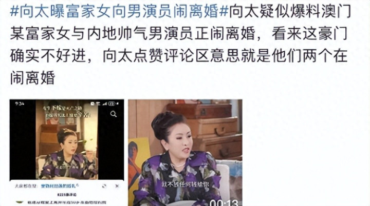 起因是向太在社交平台上曝料,说圈内有一富家千金和男演员在闹离婚。