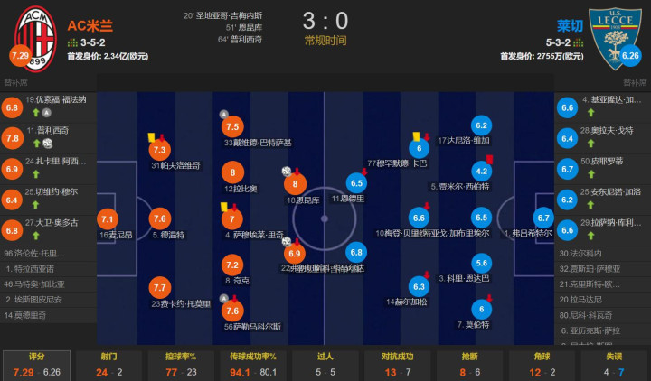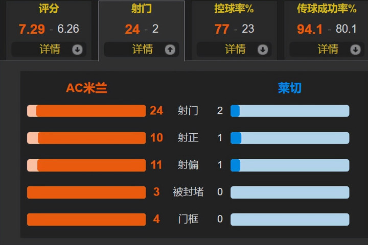 比赛数据进一步说明了这是一场完全一边倒的比赛,米兰的控球率为77%,狂射24脚,其中10次射正;莱切2射1正。